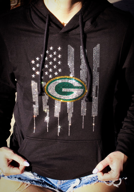 Green Bay Packers Black Hoodie, Rhinestone Bling Packers Sweatshirt